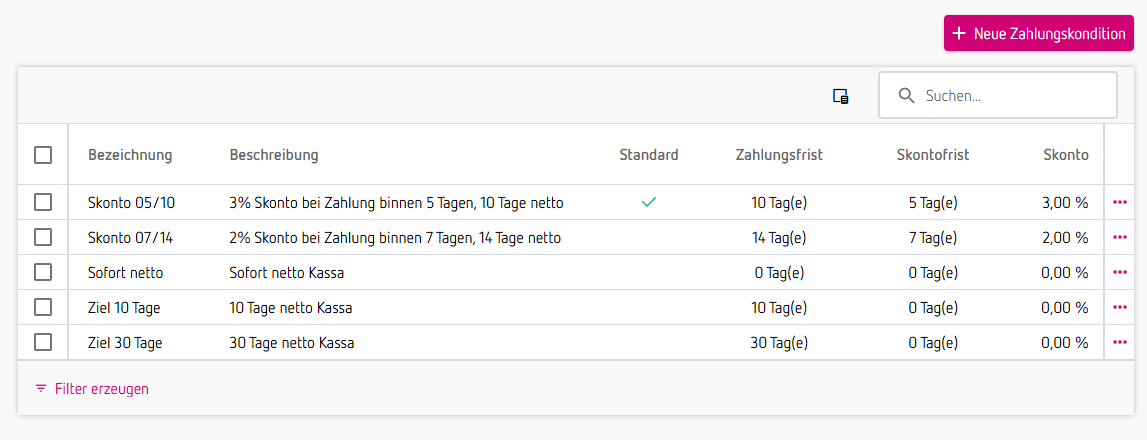 Um eine neue Zahlungskonditionen anzulegen, klicke auf den Button "Neue Zahlungskondition". Mit Klick auf die drei Punkte am Ende der Zeile der gewünschten Zahlungskonditionen kannst du diese löschen oder als Standard markieren.
