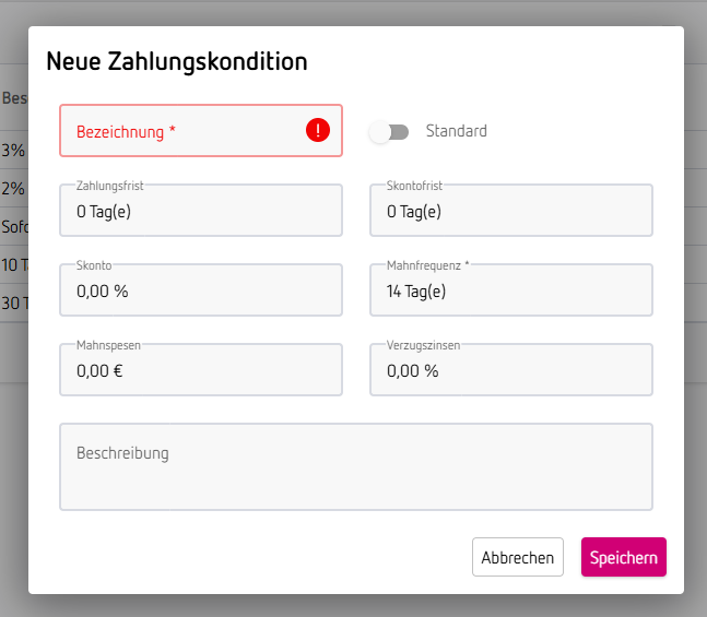 Nach Klick auf "Neue Zahlungskondition " kannst du alle erforderlichen Daten eingeben.
